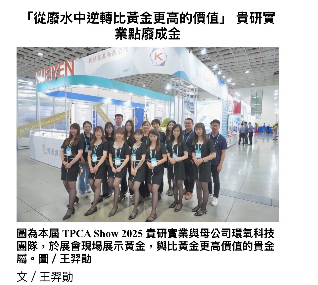 本屆 TPCA Show 2025 展會中,大會以「淨零製造 × 永續供應鏈 × 綠色製程減碳」為核心價值,強調 PCB 與電子製造業須從原料端導入循環與減碳策略,建立完整 ESG 生態系。在此永續趨勢下, 貴研實業(母公司:環氧科技)以「極低含量貴金屬回收 × 低碳提純 × 永續供應鏈」為主軸,展示前端回收概念、選擇性吸附材料、再生貴金屬粉末與特化瓶裝原料,完整呈現從廢水端回收、提純再生、回流製程的循環路徑,實踐「回收即供應、循環即減碳」的永續價值。攤位也吸引眾多 PCB、IC 載板及電鍍產業鏈客戶駐足洽詢,成為展會焦點之一。
